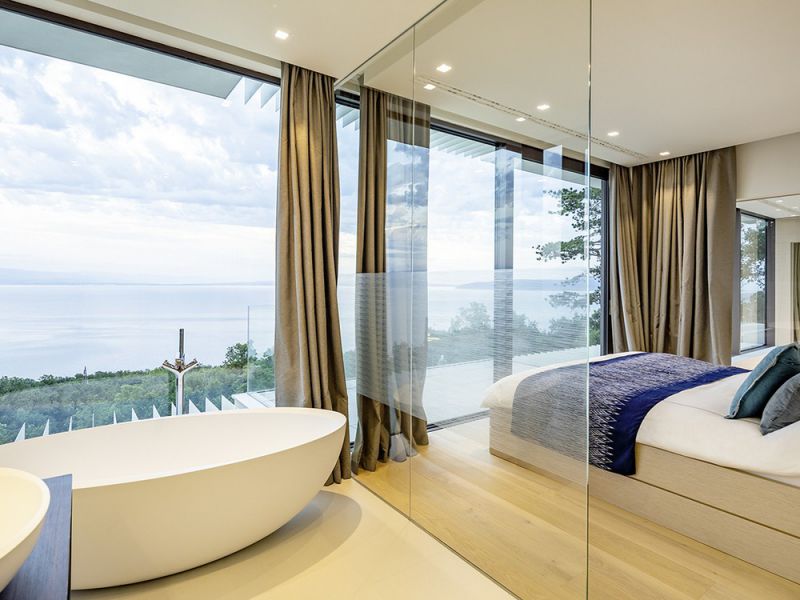 The ground floor, and also the main floor, has the main entrance to the villa, gorgeous open living and dining areas with a beautifully designed kitchen, fireplace, sauna, exercise room, media room and one ensuite bedroom. Incredible architecture combined with simple interiors is the winning combination for Villa Aura. The sea views are truly inspiring making large terraces the key feature of the property. There is no better place to be at sunset than sipping a cocktail on the terrace while admiring unobstructed sea views.